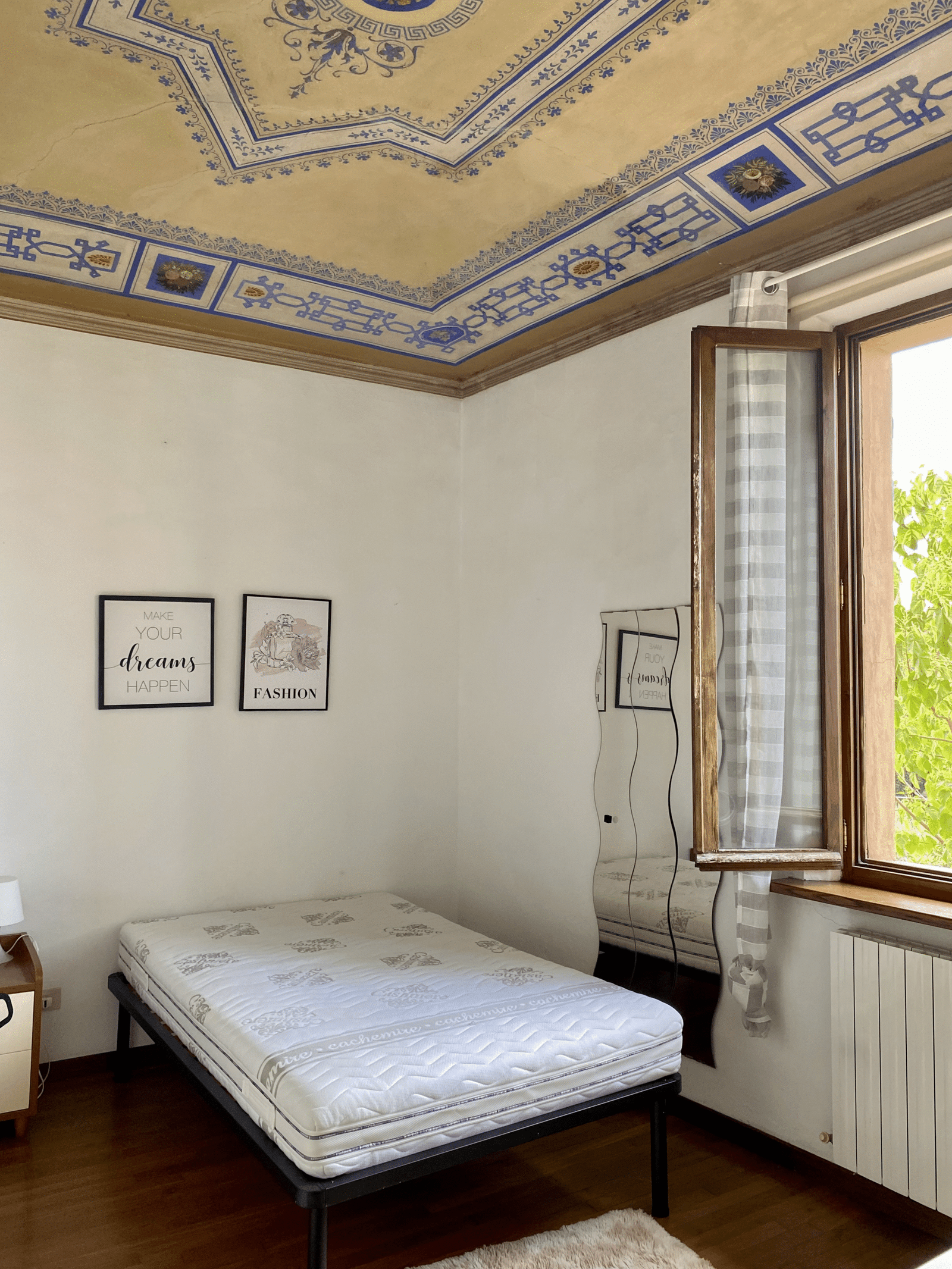 The apartment’s high ceilings and intricate medieval frescoes create a captivating atmosphere, while the view over the neighboring private garden provides a tranquil oasis amidst the city’s vibrant energy. Each of the three double bedrooms is generously sized, ensuring ample space for relaxation and study. The open-plan living room and kitchen create a welcoming environment for entertaining and socializing.